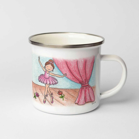 Zománcozott fém bögre balerinás mintával, amely felirattal névre szólóvá is tehető.A fém anyag miatt mikrohullámú sütőbe nem tehető be. Mosogatógépben tisztítható.