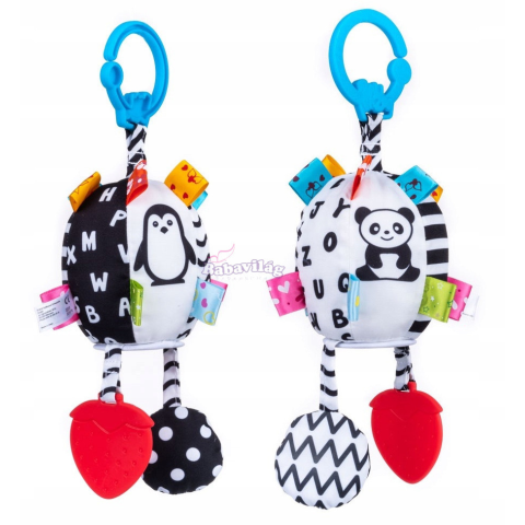 A fogantyúnak köszönhetően a játék babakocsira, hordozóra vagy kiságyra akasztható. A labdán kontrasztos csíkok és különböző textúrájú színes címkék is találhatók, alatta pedig egy biztonságos tükör a kisgyermek önfelfedezéséhez! A játékhoz rögzített rá
