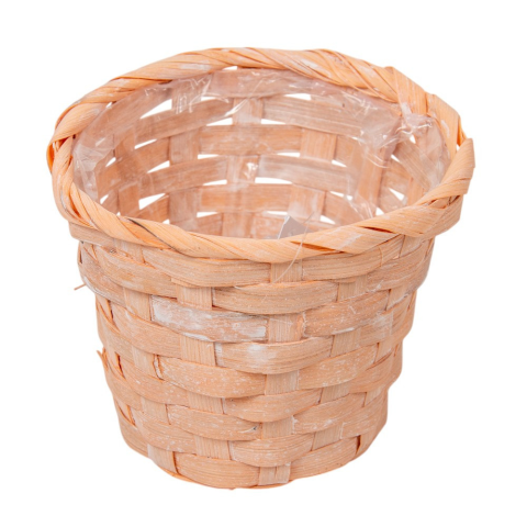 Kerek Bambusz Kosár – Barack Színű (13 x 10 cm) Természetes hatású, barack színű kerek bambusz kosár, amely praktikus és stílusos választás bármilyen dekorációhoz vagy tárolási célra. A kosár belső fóliabéléssel rendelkezik, így ideális növények, virágok,