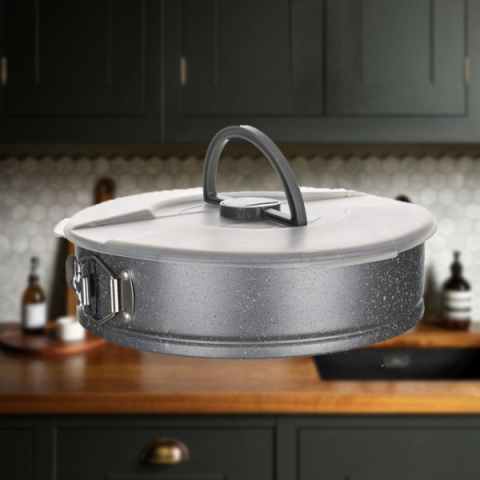 Műanyag fedelű tortaforma Gránit, átmérője 26 cm, magassága 8 cm, falvastagsága 0,4 mm. A tepsi és a tapadásmentes felületű sütőformák nélkülözhetetlen segítői minden konyhában. A XYNFLON tapadásmentes felülete PTFE - politetrafluoretilén alapú, rendkívül tartós, első osztályú tapadásgátló tulajdonságokkal rendelkezik és könnyen karbantartható.