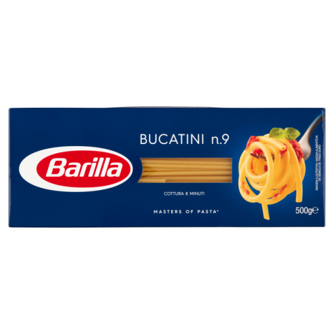 Barilla tészta 500 gr. Bucattini 24 db/karton Barilla bucatini, durum, száraz tészta. Bucatini: jelentése hosszú metélt. Javasolt főzési idő 8 perc. Tárolási információ: száraz, hűvös helyen tárolandó! Származási hely: Olaszország Összetevők: durumbúz