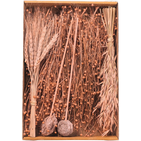 A szárított virágokat tartalmazó barkácsdoboz az adventi- vagy karácsonyi időszakra ideális. Kreatív lehetőségeket kínál az adventi koszorúk vagy a bejárati ajtó díszítőelemeinek kialakítására. A szárított virág válogatás különböző formájú és színű növényeket és virágokat tartalmaz. A doboz méretei: 5 cm x 26 cm x 38 cm (Ma x Sz x Mé). Tartalma minden beltéri helyiségben használható.
