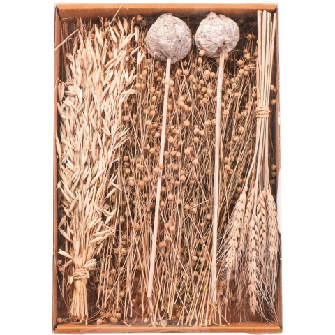 A szárított növényeket tartalmazó barkácsdobozt a téli időszakban használhatja egyedi dekorációként. Használja a tartalmát ünnepi asztaldíszek vagy a komód dekorációjának elkészítésére is. A doboz mérete 5 cm x 38 cm x 26 cm (Ma x Sz x Mé). Különböző méretű és formájú természetes szárított virágokat tartalmaz. A dekorációs anyag beltéri használatra alkalmas.