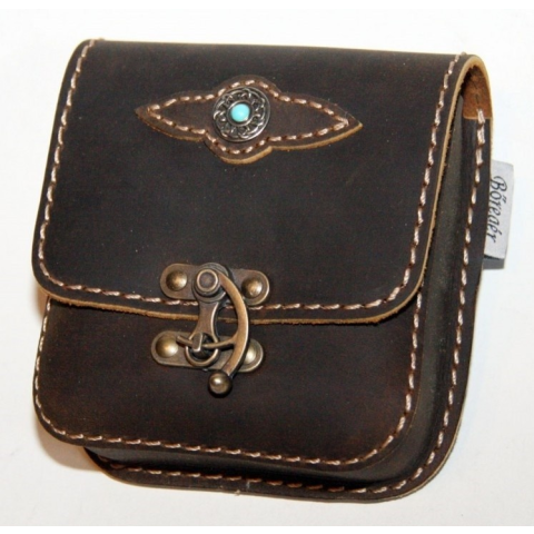 Valódi marhabőr övtáska, Magyar Kézműves Termék. Valódi marhabőrből, díszvarrással, egy fakkal, horgas csattal. Elején fém dísz kék kővel. Hátulján 2 db bőr bújtató az övhöz való felfogatáshoz. A színárnyalat eltérhet a képen látottól. Külső méretek: 13