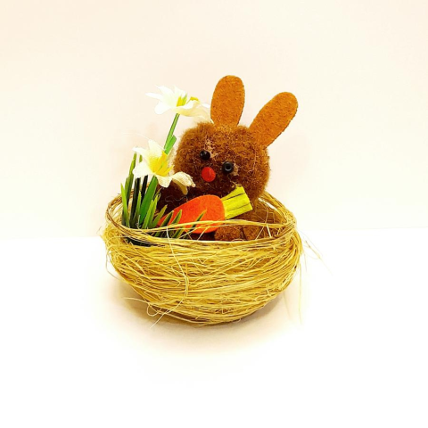 Barna nyuszifigura filc répával és virággal, fészekben. Aranyos kiegészítője húsvéti alkotásaidnak, de önmagában is tökéletes dekoráció.