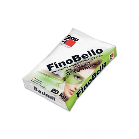 Baumit FinoBello 20 kg gipszes glettanyag (0-10 mm) Beltéri fehér univerzális kézi gipszes glettanyag 0–10 mm-es vastagságban. Optimális választás mész-cement, cement- és gipszes vakolatokra, betonfelületekre, gipszkartonszerkezetek hézagkitöltésére (üveg