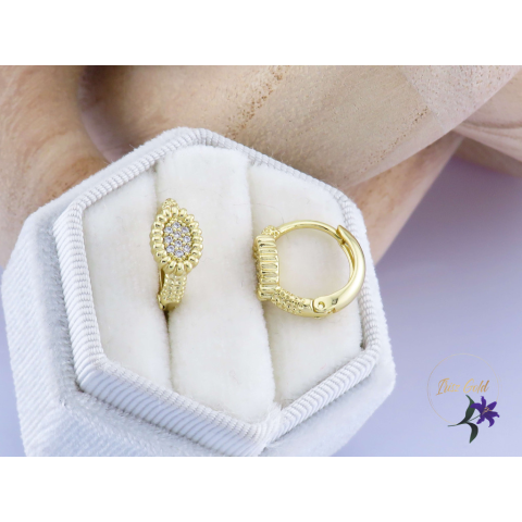 Elegáns, antiallergén Bea kiskarika fülbevaló ovális díszítéssel, 14K arany bevonattal. Nikkel- és ólommentes alapanyagának köszönhetően fémérzékenyek is bátran viselhetik. Tartós, kopásálló felület, gondosan csiszolt cirkónium kö