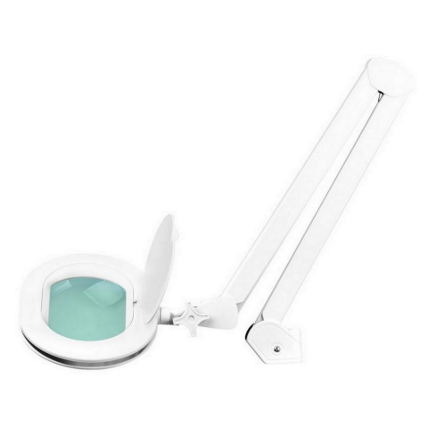 A fehér színű, stabil fémszerkezetű BeautyOne Elegante 6028 60 LED kozmetikai lámpa nagyítója akár 5 dioptriás nagyítást tesz lehetővé a kozmetikai és wellness szalonok aprólékos munkáihoz.