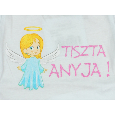A bébi rövid ujjú kombidressz igazán egyedi és stílusos választás a kis babák számára. A 24-36 hónapos kislányokra tervezett, fehér színű body a Tiszta Anyja! felirattal és angyalka mintával mindenkit elbűvöl. A vállán található patentok lehetővé teszik a