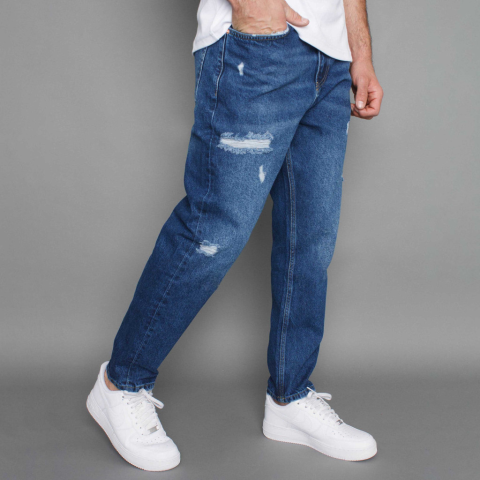 Tapered Fit, laza szabású sötétkék szaggatott és enyhén koptatott farmer, lefelé szűkülő fazon , zsebekkel és gombos sliccel Modell: 185 cm/ 85 kg/ 33-as méret