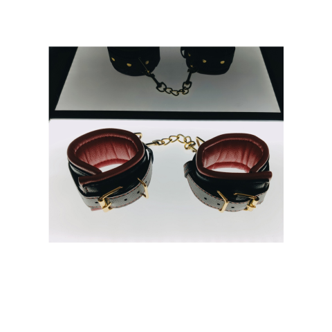 Bécs fekete,piros vegán bőr bilincs.Szép kidolgozás -mintha igazi bőr lenne szinte.Levehető karabíner lánccal.Párnázott belső -kényelmes.Állítható méret.Szélessége:5,8cm.