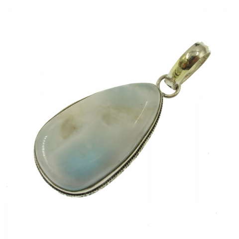 Ezüstbe Foglalt Larimar Medál: Egyedi, Természetes Kék Delfinkő 🐬 Ez a gyönyörű medál egy ritka, természetes Larimar ásványból (más néven kék pektolit vagy delfinkő) készült, kézzel készített ékszer. A cabochon kövek gyönyörű égkék színűek, felhősze...