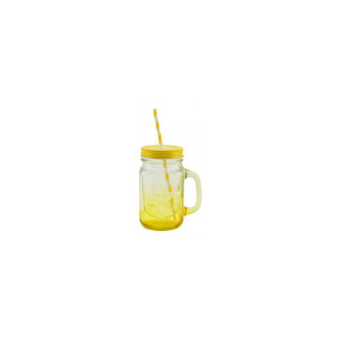 A Befőttesüveg bögre, szívószállal és fém csavaros tetővel ellátott. Különleges, sárga színnel rendelkezik. Űrtartalma 450 ml, melynek magassága 135 mm, a szívószál hosszúsága 198 mm. A színes befőttesüveg bögre stílusos és vidám megjelenést kölcsönöznek. Kiválóan alkalmas partikra, egyéb összejövetelekre a koktél, szörp, limonádé elfogyasztásához.