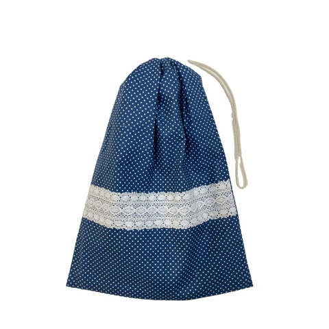 1 kép Behúzós zsák – kék-fehér pöttyös, csipkés pamut és PUL bélés