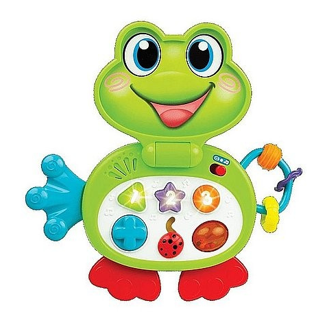 Béka junior laptop bébijáték Vidám készségfejlesztő békás laptop, fényekkel és hangokkal! A Béka junior laptop bébijáték egy műanyagból készült kinyitható bébijáték, ami egy aranyos békát formáz A laptop színes gombjai külömbféle fényeket és hangokat