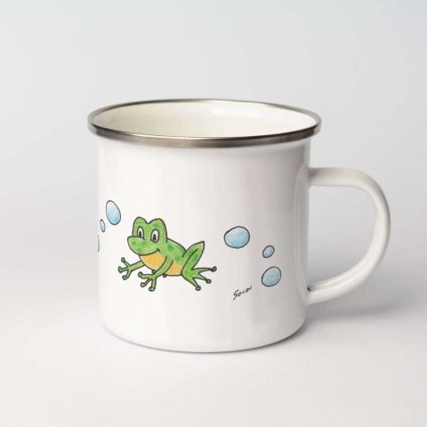 Zománcozott fém bögre békás mintával, amely névre szólóvá is tehető.A fém anyag miatt mikrohullámú sütőbe nem tehető be. Mosogatógépben tisztítható.