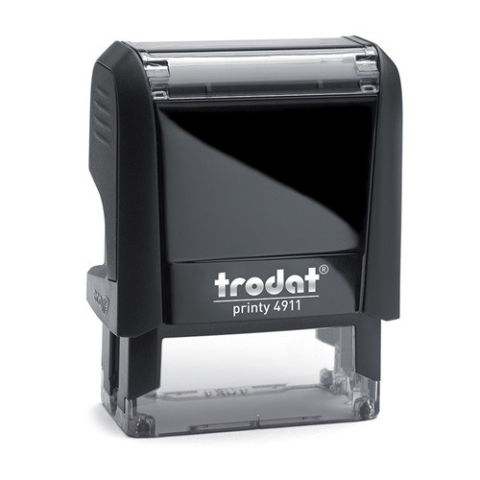Bélyegzőház Trodat 4911 4.0 fekete, fekete párnával Megnevezés: Trodat 4911 bélyegző Bélyegzőházszín: fekete Lenyomatszín: fekete lenyomatméret: 38 × 14 mm javasotl sorok száma: 4 cserepárna: 6/4911