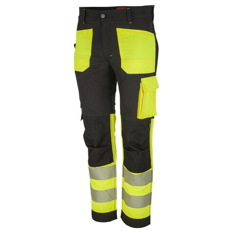 Férfi sztreccs munkanadrág, amely megfelel az 1-es osztályú láthatósági követelményekre vonatkozó szabványnaknagyon erős, ellenálló anyag, ülep- és ágyékrészen rendkívül rugalmasa térdek nagyobb igénybevételnek kitett részei Cordura 500D anyaggal megerősí