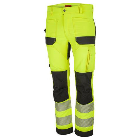 Férfi sztreccs munkanadrág, amely megfelel a 2-es osztályú láthatósági követelményekre vonatkozó szabványnaknagyon erős, ellenálló anyag, ülep- és ágyékrészen rendkívül rugalmasa térdek nagyobb igénybevételnek kitett részei Cordura 500D anyaggal megerősít