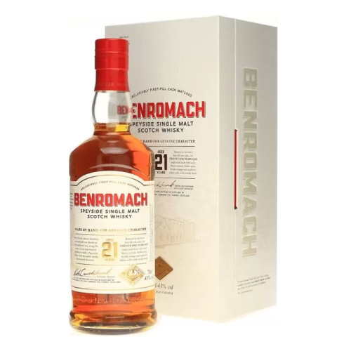 A Benromach 21 éves Speyside Single Malt Scotch Whisky egy különleges single malt whisky, amely a Benromach Distillery érett és kifinomult stílusát képviseli. Ez a whisky 21 évnyi érlelés után gazdag és komplex ízvilágot kínál, amely a Speyside régióra je