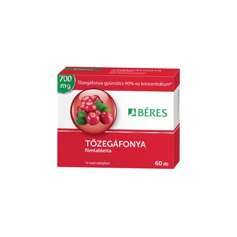 Béres Tőzegáfonya filmtabletta étrend-kiegészítő készítmény. 700 mg Tőzegáfonya gyümölcs 90%-os koncentrátum a napi adagban.Összetevők: tőzegáfonya gyümölcskoncentrátum, dikalciumfoszfát, mikrokristályos cellulóz, hidroxi-propilmetil- cellulóz, aszko
