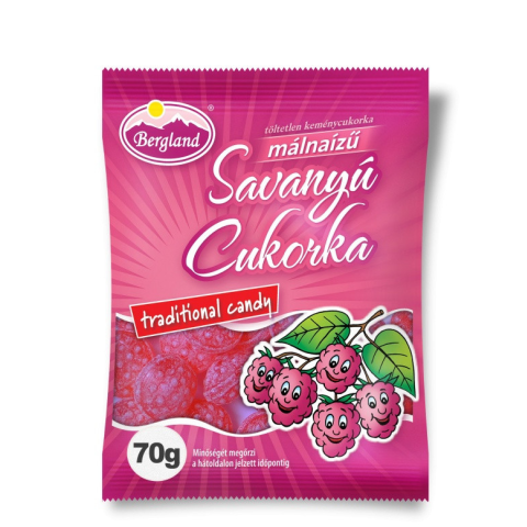 2 kép Bergland málna ízű savanyú töltetlen keménycukorka 70g