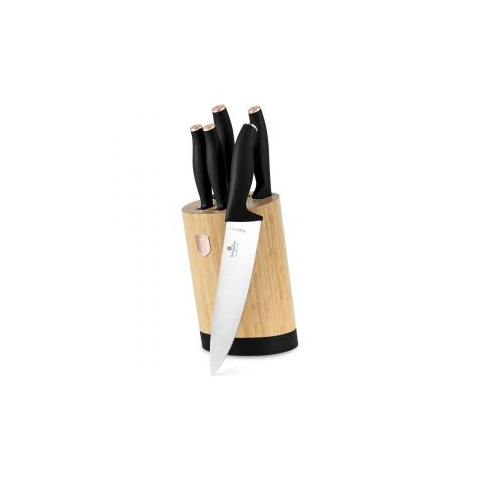 Berlinger Haus Késkészlet 6 részes rozsdamentes Black Rose Collection BH/2752 - Anyaga : Rozsdamentes acél penge - E rgonomikus kialakítású, tartós és puha érintésû mûanyag fogantyúk - Tartalma: 1 db 20 cm séf kés, 1 db 20 cm kenyérkés, 1 db 17,5 cm santoku kés, 1 db 12,5 cm általános kés, 1 db 9 cm santoku kés, 1 db bambusz késtartó blokk kerek alakú - Antibakteriális és nem hagy foltot, valamint nem tartja meg az étel szagát