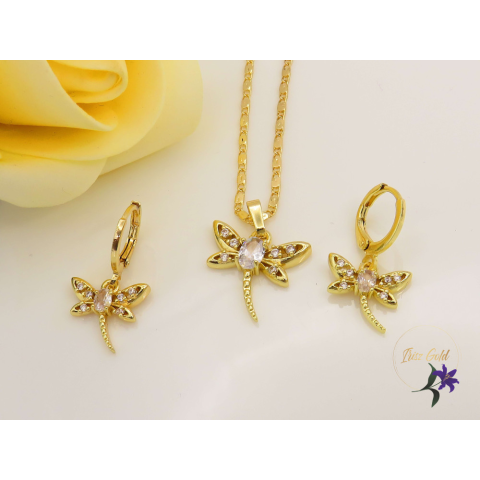 Goldfilled szett nyaklánc, fülbevaló szitakötő medállal fehér kővelSzin: 14 K Méret: 47cm / 2mm Medál: 20x18 mm Fülbevaló : 25x14 mm Fülbevaló zár :karika 10mm
