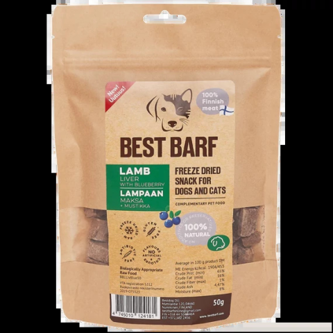 A Best Barf fagyasztva szárított báránymáj + áfonya egy ínycsiklandó és egészséges snack, amelyet használhatsz jutalomfalatként vagy kiegészítheted, felturbózhatod vele kutyád, macskád vagy más húsevő kedvenced étrendjét