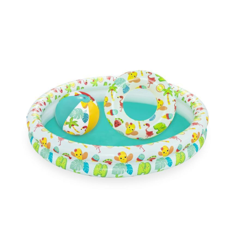 A színes, nyári témájú Bestway® 59460 Play Pool Set játékmedence egyszerűen kicsalogatja a gyermekeket a házból a napsütésre. Minőségét és tartósságát előre teszteltük, hogy kibírja a gyermekek furfangos vízi játékait. Ez a felfújható medencekészlet tökél