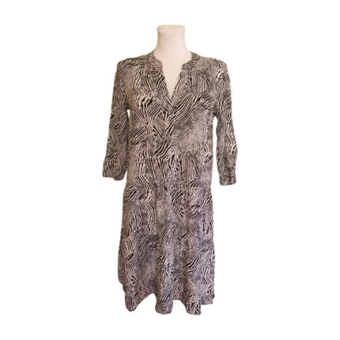 Ez a Betty Barclay barna zebramintás női ruha egy nagyon csinos, nyári darab. Anyaga vékony, jól szellőző. Fazonja klasszikus ingruha jellegű, amely a meleg időben is lenge érzetet kelt. Jól kombinálható bármilyen nyári kiegészítővel