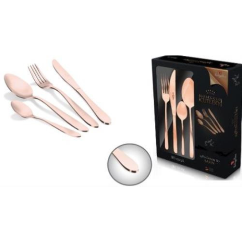 Részletek és Jellemzők Anyaga: Rozsdamentes acél szatén bevonattal Szín: Rózsaarany A szett tartalma 6 db étkező kés (5,0 mm vastagság) 6 db étkező villa (3,0 mm vastagság) 6 db étkező kanál (3,0 mm vastagság) 6 db teás kanál (2,0 mm vastagság)