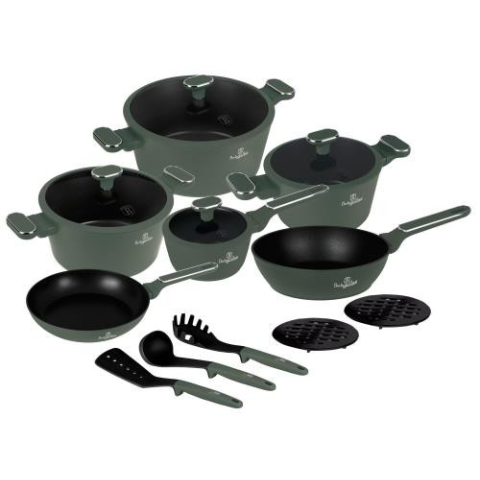 Berlinger Haus Edénykészlet 15 részes tapadásmentes Matte Green BH/8208 - Anyaga: kovácsolt alumínium, 3 rétegű tapadásmentes titánPro bevonat - Turbó indukciós talp segíti a gyors és energiatakarékos főzést - Mosogatógépben mosható, könnyen tisztítható