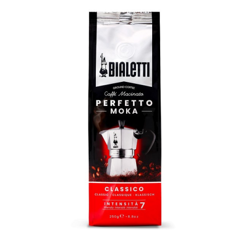 Bialetti Moka Perfetto Classico őrölt kávé, egy lágy, aromás kávé keverék, amelyben a kolumbiai Excelso fajta jelenléte édeskés virág- és dióaromákat biztosít, amelyeket a klasszikus lassú, közepes erősségű pörkölés tesz hangsú