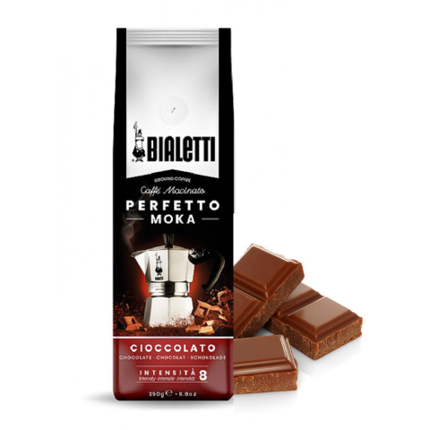 A Bialetti csokoládés őrölt kávé egy 50% arabica / 50% robuszta összetételű valódi ínyenc őrölt kávé csokoládé aromával, karamellizált jegyekkel, valamint testes és intenzív ízvilággal. Közepes erősségű pörkölés, harmonikus