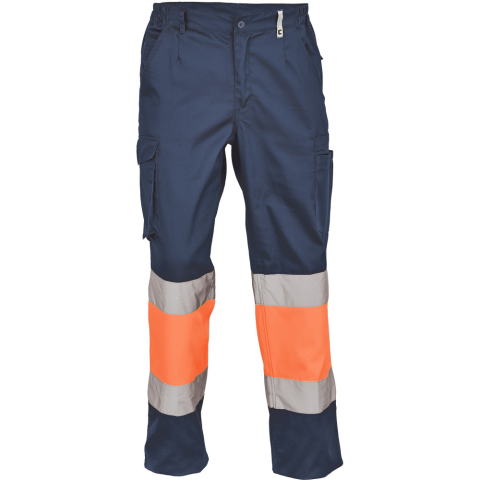 BILBAO HV nadrág navy/narancssárga 62 • férfi munkanadrág 7 cm széles fényvisszavető csíkokkal és Hi-Vis elemekkel • 2 első zseb + 1 érmezseb • 2 oldalzseb • 2 hátsó zseb • rugalmas oldalsó betétek a derékpánton • leengedhető szárak