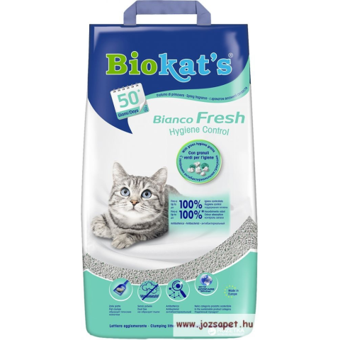 Biokats Fresh Bianco macskaalom 5kg Biokats Fresh Bianco illatos Macskaalom - A Biokats Fresh egy hófehér, illatósított alom, mely a macskavécét ember és állat számára egyaránt kellemes, friss illatúvá teszi. A természetes agyag alom tovább marad higiénik