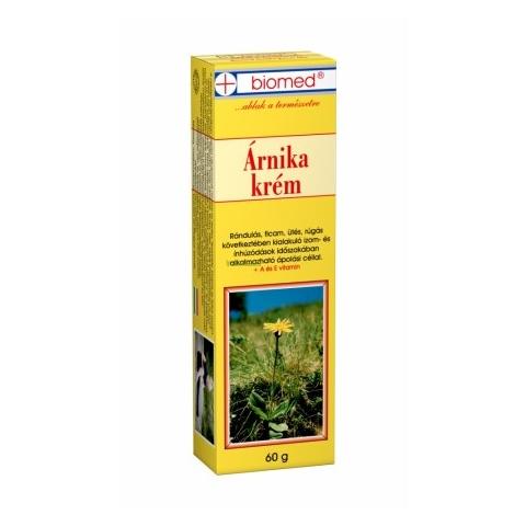 Biomed Árnika Krém 60 g Az árnika a legismertebb és legnépszerűbb gyógynövények közé tartozik. 'Hatóanyagai tágítják a hajszálereket és vérbőséget okoznak, így gyors gyulladás- és fájdalomcsökkentő hatással rendelkeznek. ' Krémünk különösen hatásos külön
