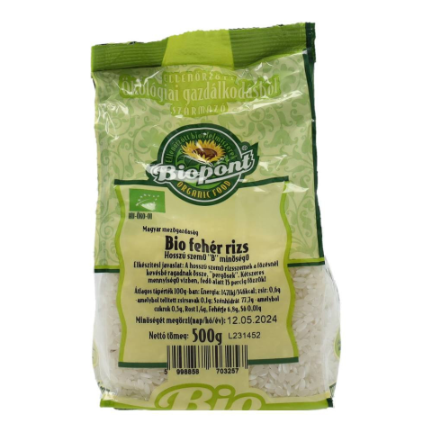Biopont Bio fehér rizs hosszúszemű 500 g – tiszta, bio rizs pergős állaggal. Sokoldalú, gyorsan elkészülő köret természetes, adalékmentes minőségben.