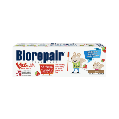 Biorepair Kids fogkrém eper kivonattal 0-6 éves gyermekeknek. A Biorepair Kids fogkrém védi, erősíti és egészségesebbé teszi a fogakat. A tejfogak zománca vékonyabb és sérülékenyebb, mint a maradó fogaké. Fontos a fogzománcot újraásványosítani, hogy