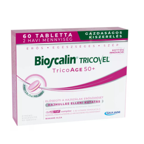 A Bioscalin® Tricovel TricoAGE 50+ egy különleges étrend-kiegészítő, amelyet a Giuliani laboratóriumok kifejezetten az 50 év feletti nők számára fejlesztettek ki. Célja, hogy támogassa a haj természetes anyagcsere-folyamatait, elősegítve annak erősítését,
