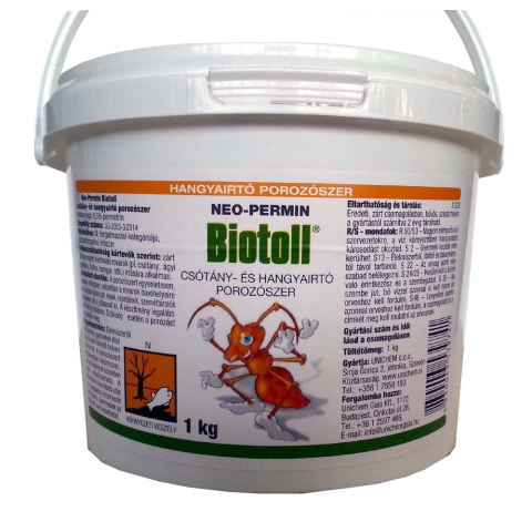 Biotoll Neopermin porozószer Kiváló ár érték arányú rovarirtó porozószer, ipari kiszerelésben. Alkalmas bármilyen ház körül és azon belül élősködő mászórovar irtására Hatóanyag: permetrin