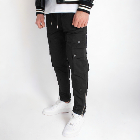 Regular Fit szabású fekete nadrág, fényes anyagú, gumis derékkal és vékony húzózsinórral, elöl patentos zsebekkel, oldalzsebbel és cipzáros szárvéggel Modell: 185 cm/ 85 kg/ L-es méret