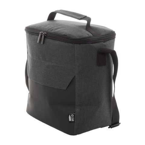 Cipzáras hűtőtáska RPET anyagból műbőr részletekkel és PEVA párnázattal. Fogantyúval, állítható vállpánttal és kis első zsebbel. 600D RPET poliészter, megkülönböztető RPET címkével.