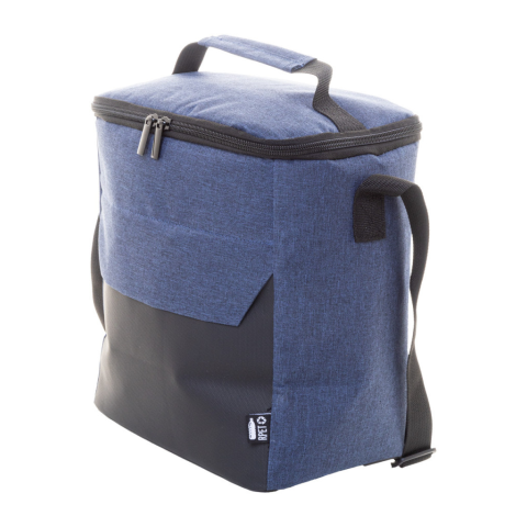 Cipzáras hűtőtáska RPET anyagból műbőr részletekkel és PEVA párnázattal. Fogantyúval, állítható vállpánttal és kis első zsebbel. 600D RPET poliészter, megkülönböztető RPET címkével.