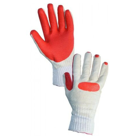 Varratmentes kesztyű Vastag fonal, 65% poliészter, 35% pamut Dombornyomott latexba mártott Gumírozott mandzsetta Szövés sűrűség: 10 Kesztyű hossza: 25-27 cm Cat. 2. EN ISO 21420, EN 388 (3142X)