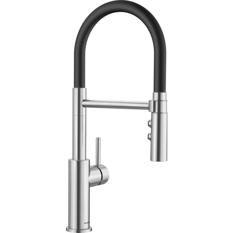 BLANCO CATRIS-S Flexo PVD steel Klasszikus vonalak félprofesszionális formatervezéssel és igényes kialakítással A rugalmas, fekete színű gumitömlő optimális mozgási lehetőséget biztosít Kétállású zuhany, könnyű váltás a normál vízsugár és a zuhanys