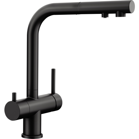 BLANCO FONTAS-S II matt fekete HD Kényelmes 3 az 1-ben csaptelep: szűrt és szűretlen víz a kihúzható tömlőből. Fekete matt felületkezelés a környezethez való pontos illeszkedés érdekében. Különálló vízkör: hideg- és melegvíz-kar a jobb oldalon, szűrtví