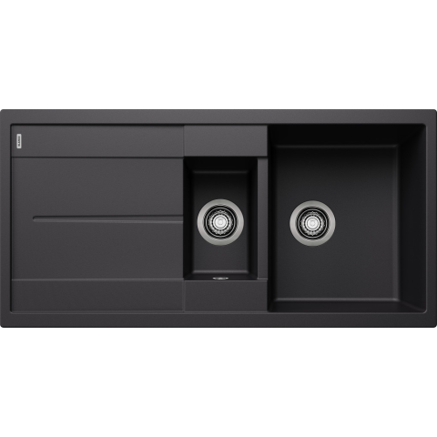 BLANCO METRA 6 S fekete exc. nélkül Lefolyógarnitúra helytakarékos csővel, 2 x 3 1/2“-os szűrőkosárral Fiatalos, egyenes vonalú kialakítás. Vonzó termékcsalád a népszerű szegmensben. A különösen nagyméretű főmedence felülmúlhatatlanul sok helyet b