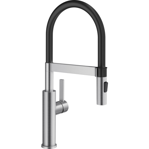 BLANCO SONEA-S FLEXO tömör rm. acél Klasszikus csap kialakítás fekete elemekkel modern konyháhozKiváló minőségű csap tömör rozsdamentes acélból, szálcsiszolt felülettelA rugalmas, fekete tömlő optimális mozgásszabadságot biztosítA zuhanyfej könnyen vál